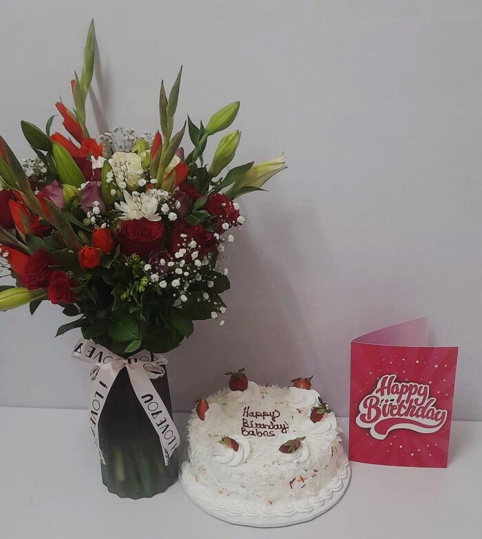 A birthday vibe package deal with a large sized vased flowers bouquet with 1 kg recipe of a whiteforest cake and a message card