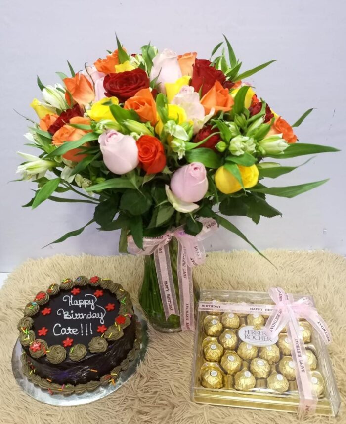 A perfect birthday package deal with a large sized vased flowers bouquet, T-24 Ferrero Rocher chocolate and 1 kg recipe of a chocolate fudge cake