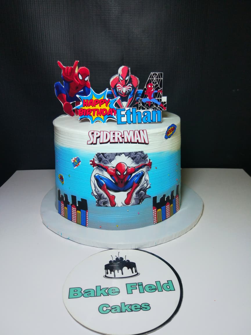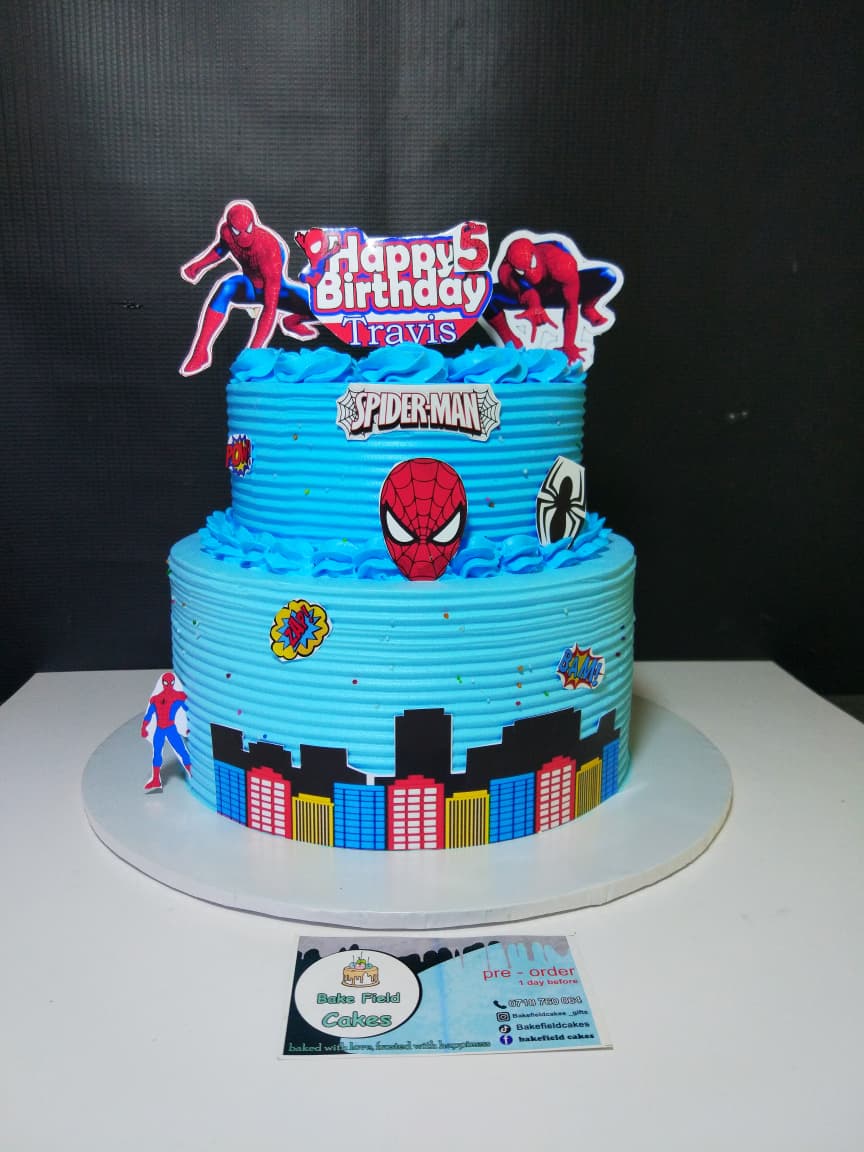Non-edible Spiderman images are placed on the cake to complete the superhero theme.