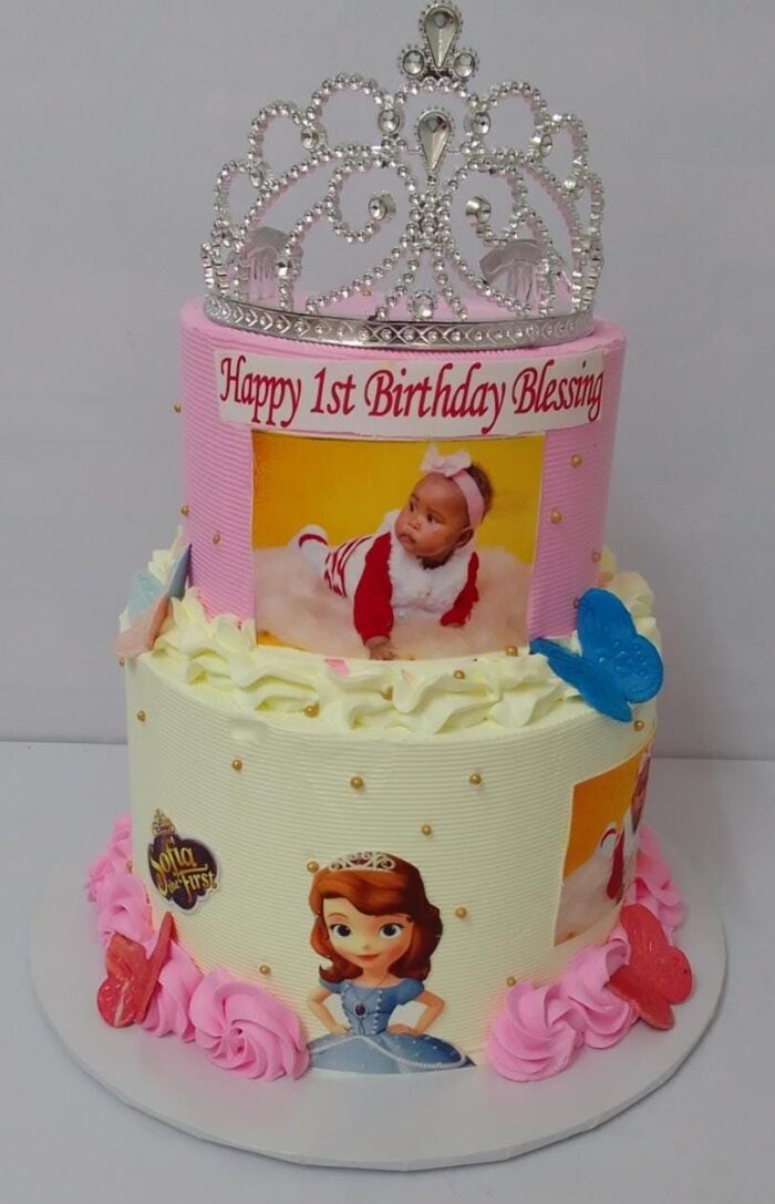 A beautiful colourful tier cake to impress the young soul and throw a queens memorable party. The cake has 2 kgs at the bottom and 1kg on top. The flavour is a mix of vanilla, chocolate and strawberry. Share the birthday kid photos on WhatsApp.
