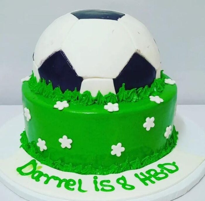 A football themed fondant cake with ball shaped on top. The cake flavour is vanilla and chocolate. This cake minimum size is 2kg.